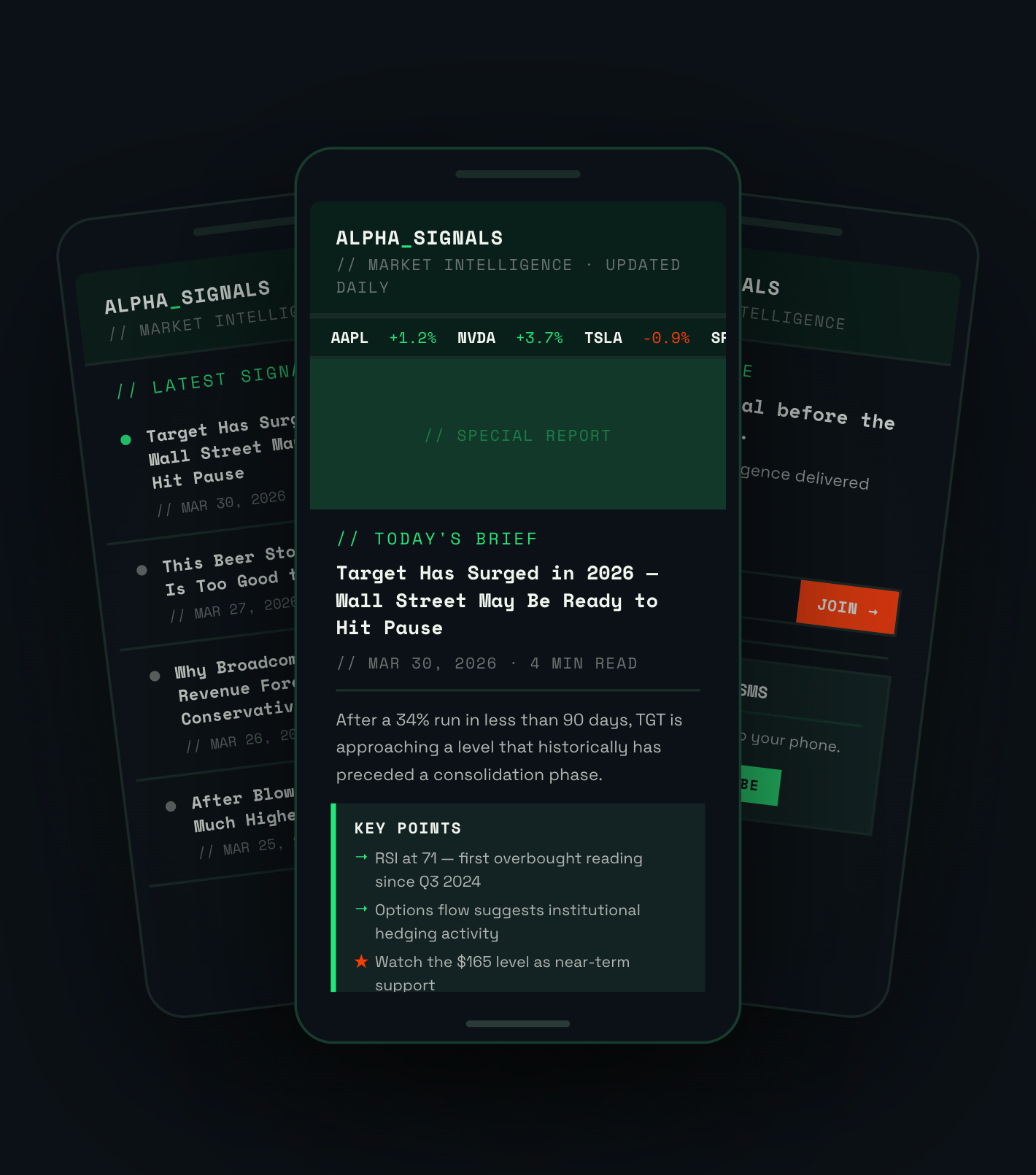 Institutional-grade analysis. Retail-accessible language. Alpha Signals delivers high-conviction intelligence before markets open — every weekday at 7am ET.